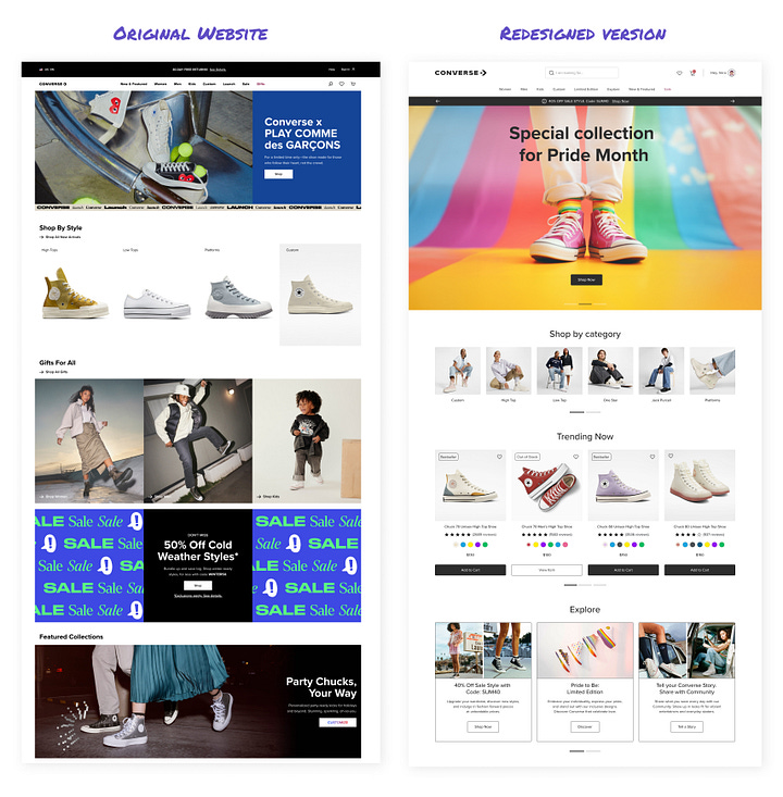 Now, with another year of experience, I analyze this work with new insights. Throughout this post, I'll share my thoughts on the original UI and UX of the Converse website, walk you through my redesign (2023), and conclude with improvement suggestions based on my current knowledge.