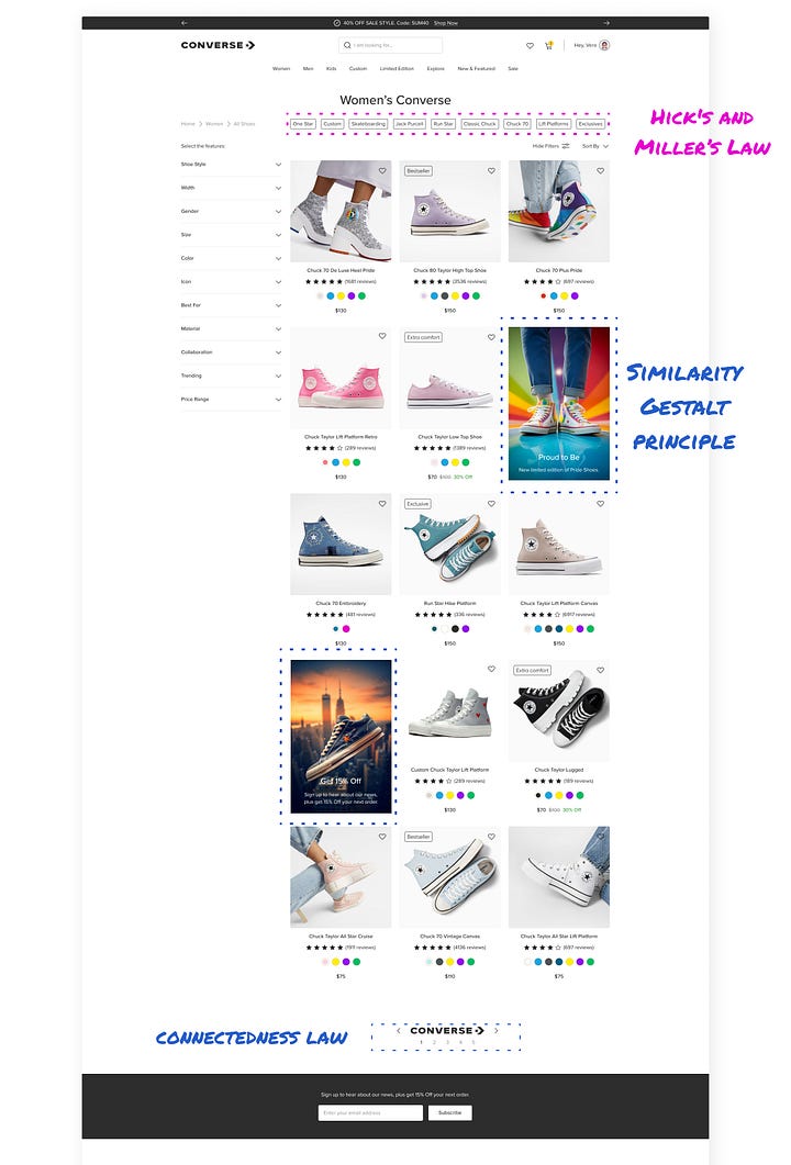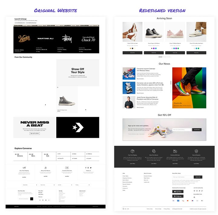 I redesigned the Converse homepage, applying key Gestalt principles and addressing previous design critiques. The new layout features and content organization improved navigation, clearer product categorization, and a stronger visual hierarchy, improving both brand identity and user experience.